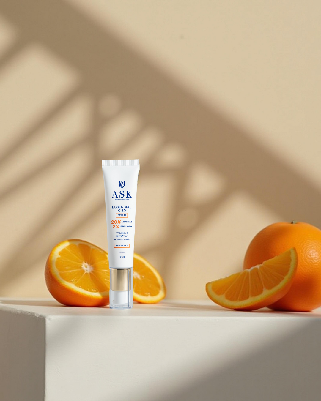 Estudos indicam que 20% é a concentração ideal de vitamina C para a pele absorver o máximo dessa substância, mantendo um reservatório antioxidante eficiente. Concentrações maiores que 20% reduzem os níveis de vitamina C na pele, provavelmente devido a um limite de absorção ainda não totalmente compreendido. Além disso, o Essencial C20 Vitamina C combina vitamina C com vitamina E, outro potente antioxidante, e niacinamida, oferecendo múltiplos benefícios para a saúde da pele.